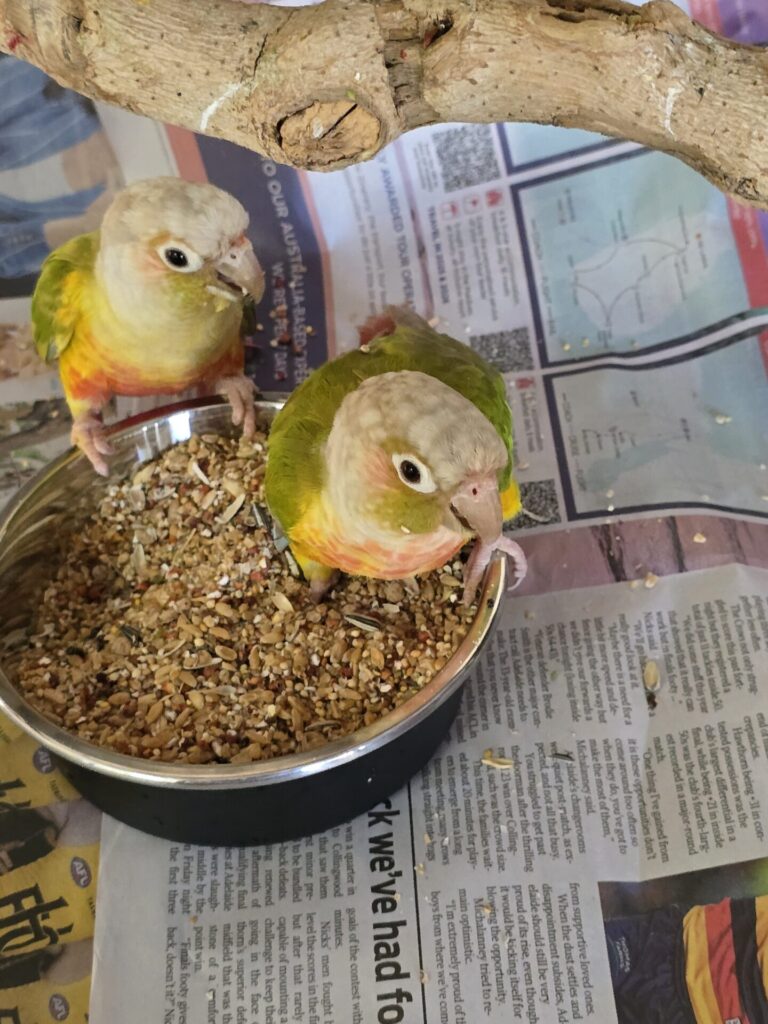 They enjoy a diet of good small parrot food, fruit, and vegetables, with apples and corn being particular favourites. Both love water and will happily take a bath. Their carer brings their cage outside on nice days so they can enjoy fresh air and sunshine, which they thoroughly enjoy. When indoors, they like having regular out-of-cage time to stretch their wings and play, and they’re good about returning to their cage on their own (though food bribery always works if needed).