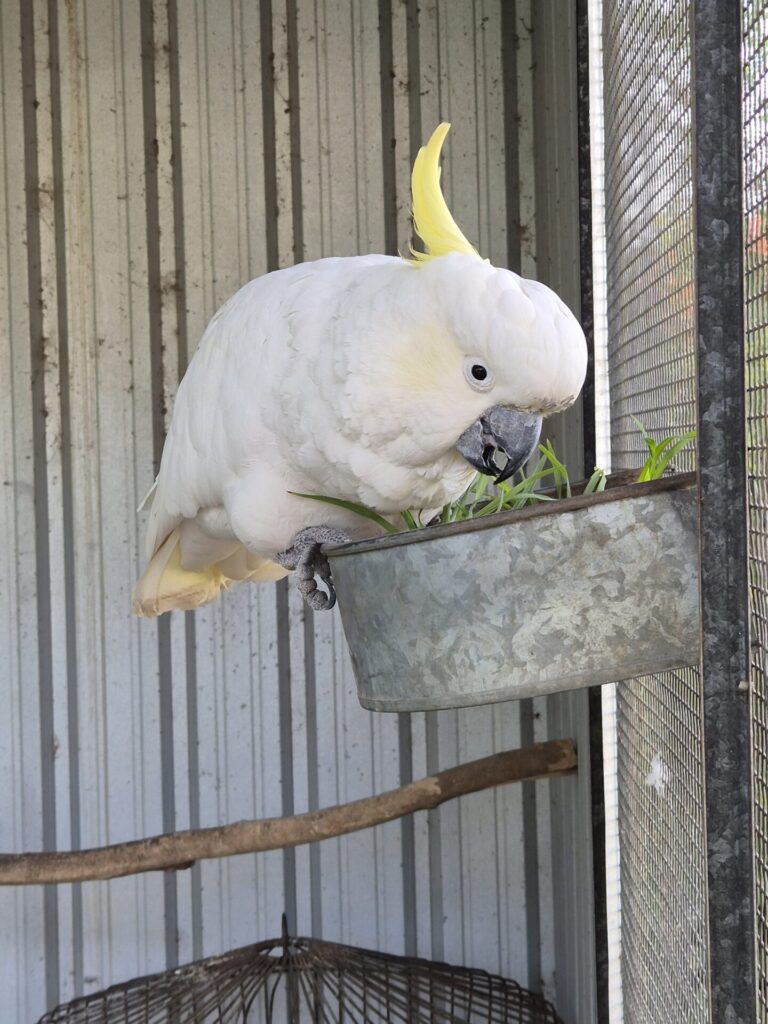 She enjoys spending her days in a large indoor aviary with a mix of indoor and outdoor time. She’s in good health, with no known issues apart from a missing nail on one foot due to an old accident.
