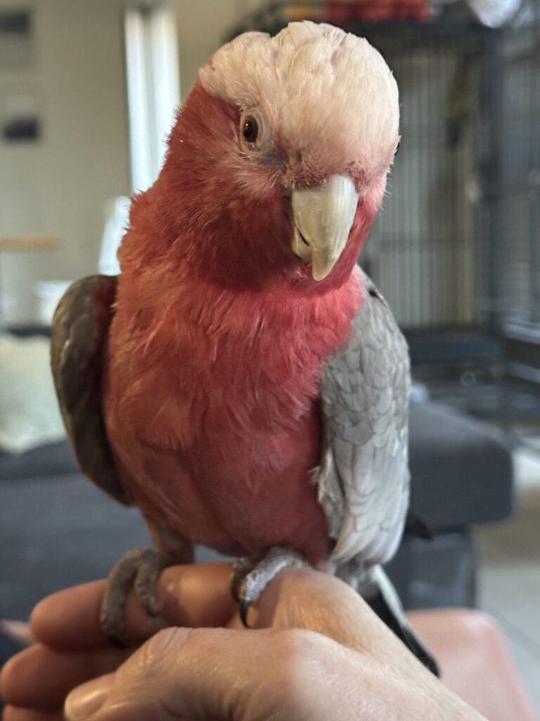 About: Meet Baby – a nine-year-old male galah with soft pink and grey plumage, looking for a loving, experienced home. He’s a sweet, selective, and slightly shy bird who thrives on gentle attention and company. Baby enjoys coming out of his cage to explore, stretch his wings, and interact with his human friends.