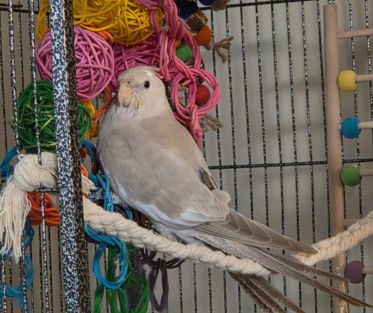 She is being rehomed in her best interests, as she has developed separation anxiety as a solo bird. Despite receiving lots of companionship, she struggles when her primary person is out of sight and becomes distressed, calling until reunited. It’s believed she would thrive in a home with another bird companion, where she can form healthy bird-to-bird bonds and feel more secure and settled.